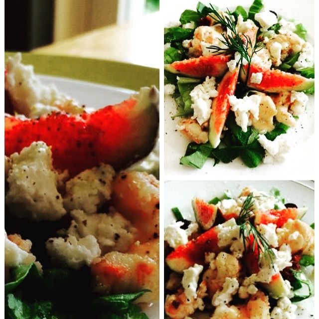 Salade met sla, kreeftjes, zwarte olijven, vijgen, gedroogde tomaatjes en geitenkaas.