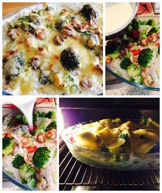 Laagjes maken met scholfilet, broccoli, ui/champignons/paprika (peper en zout). Overgieten met witte saus met mierikswortel. Geraspte kaas erover.