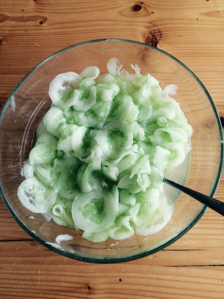 Komkommer schaven (met een kaasschaaf). Zout erover strooien en even laten staan. Daarna vocht eraf gieten, en flinke scheut azijn erover. Afmaken met zout en peper en