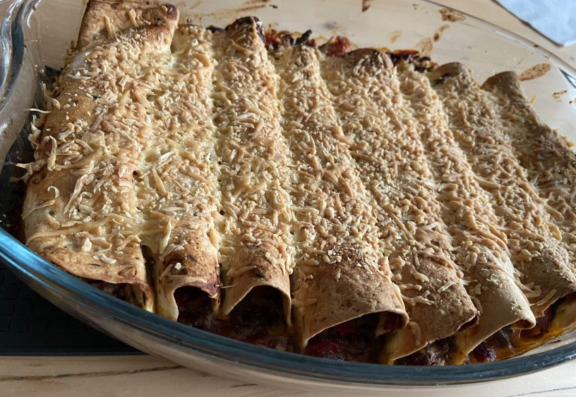 gerookte paprikapoeder, wat basilicum (liefst verse), klein blikje kidneybonen en crème fraîche. Mengsel op wraps leggen en oprollen. Geraspte kaas erover. 10 minuten in de oven op 200 graden. Serveren met zoete chilisaus.