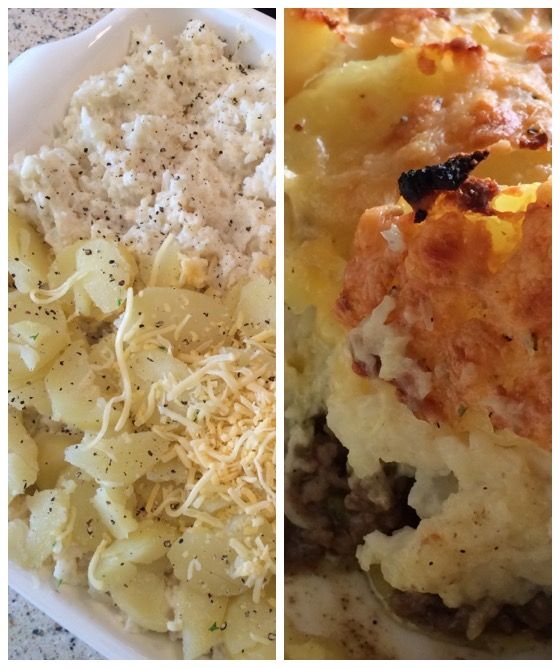 Doe dit in een ovenschaal, daar bovenop de aardappelpuree, en daar overheen de gare bloemkoolroosjes.
