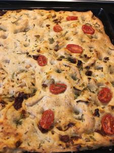 Vet een bakplaat in met olijfolie en stort daar het gerezen deeg voorzichtig op. Probeer de luchtigheid die tijdens het rijzen is ontstaan te behouden. Rek het deeg voorzichtig uit tot een mooie grootte. Bestrijk de bovenkant met nog wat olijfolie en verdeel je smaak naar keuze erover. Lekker is ook grof zeezout erover sprenkelen. Laat dit, afgedekt, nog 1 uur rijzen.
