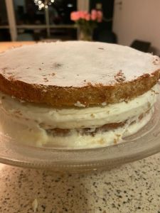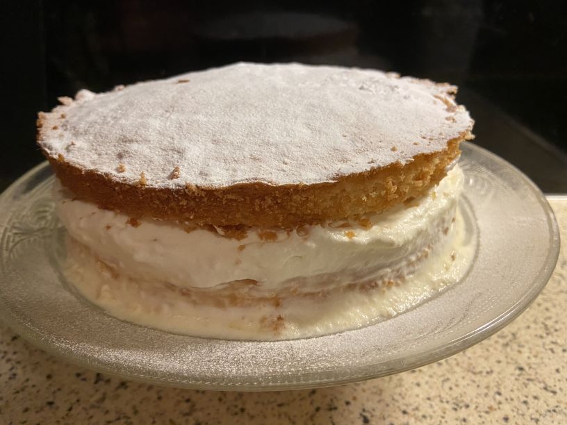 Leg één cake met de bovenkant naar onderen op een serveerschaal (want de onderkant neemt beter advocaat op). Strijk er een flinke laag advocaat op en dan de geklopte slagroom. Doe dan de ander helft erop met de bovenkant boven (want die is een beetje rond). Maak af met een beetje gezeefde poedersuiker.
