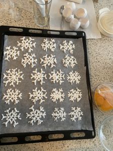 Zet 2 bakplaten klaar met bakpapier erop. Daaronder leg je het sjabloon met sneeuwvlokken. Dat kun je steeds een stukje verschuiven, zodat je de hele plaat kunt gebruiken. (Vergeet niet om voor het bakken het sjabloon te verwijderen.)