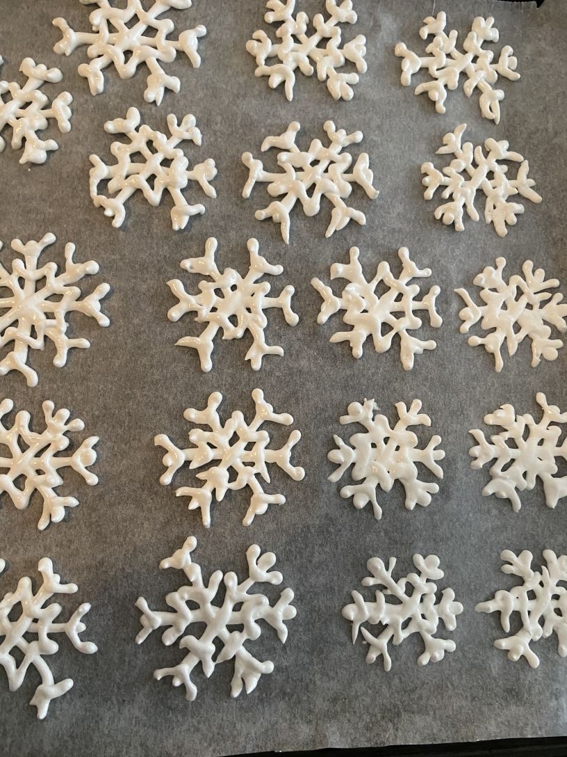 Zet de platen in de oven en laat een uur bakken op 100°C. Laat daarna in de oven staan met dichte deur en laat helemaal afkoelen (3-4 uur). Je kunt de sneeuwvlokken daarna voorzichtig opscheppen (bijv. met een kaasschaaf) en in een blik bewaren. Ze zijn heel mooi om te gebruiken als versiering op een dessert, op de warme chocolademelk, of gewoon om zo op te eten.