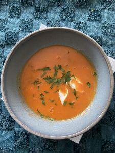 Voeg dan een flinke eetlepel tomatenpuree toe, de bouillonblokjes, en flink wat heet water. Laat dit plusminus 20 minuten koken, en zet er daarna de staafmixer in. Maak af met wat kookroom en serveer met peterselie. Ook een beetje yoghurt bij het serveren is heel erg lekker.