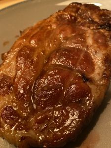 Giet wat ketjap over je schouderkarbonade. Dat kan bijv. in je ovenschaal, dat scheelt weer afwas. Met een vork kun je de karbonades even heen en weer door de ketjap halen, zodat de hele karbonade bruin wordt van de ketjap.