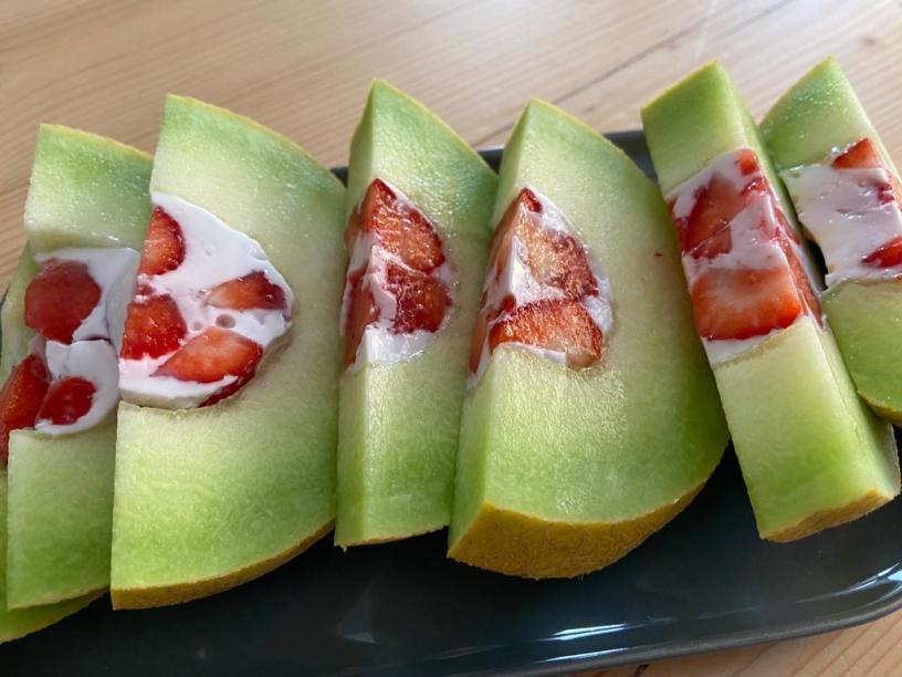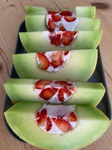 Verwarm de kokosroom in een pannetje en los daarin de geweekte gelatine op. Roer de honing erdoor. Giet dit over de aardbeien in de meloen, tot hij helemaal vol is. Zet een paar uur in de koelkast en je kunt hem in mooie plakken snijden!